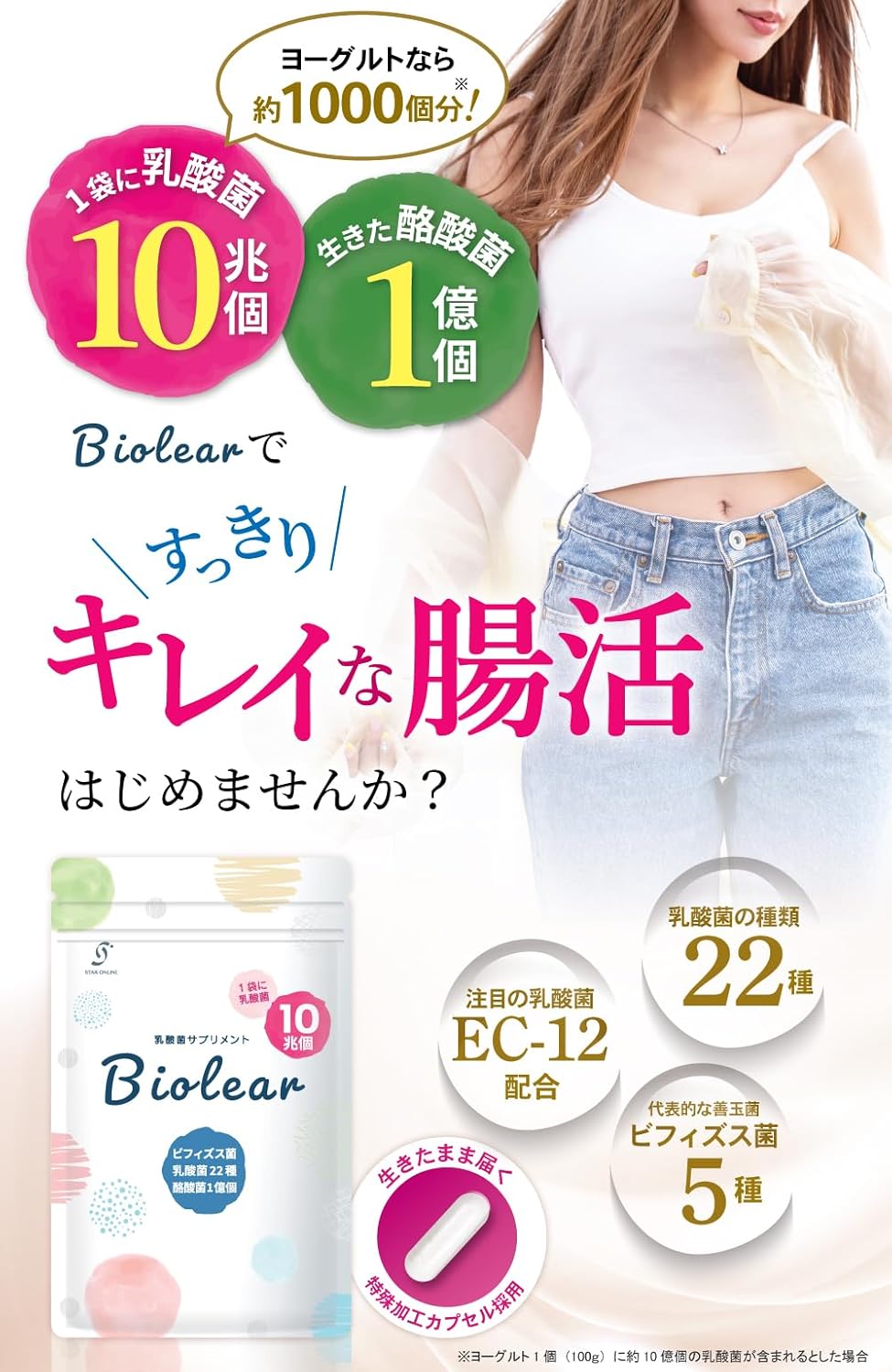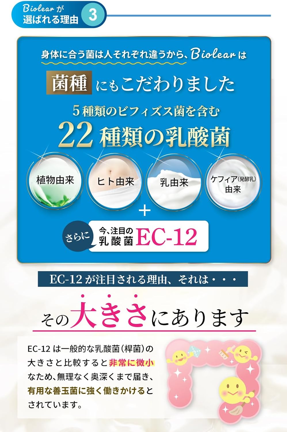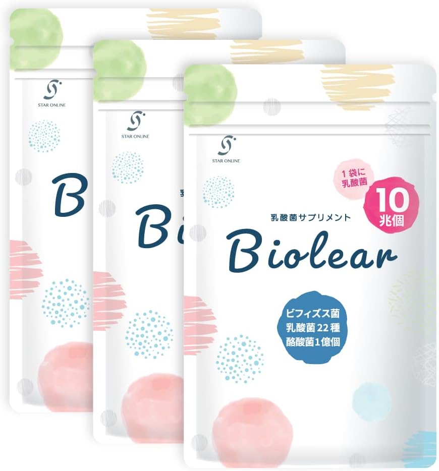 【圧倒的な総菌数】 乳酸菌は23種10兆個、生きた酪酸菌も1億個配合し、あなたの腸活をしっかりサポートします。 【厳選成分EC-12と酪酸菌を配合】 話題の乳酸菌EC-12と生きた酪酸菌をダブルで配合しました。その他にも種類豊富な乳酸菌と食物繊維、オリゴ糖を配合。あなたにピッタリの乳酸菌がきっと見つかります。 【腸まで届く耐酸性カプセル】 Biolearは打錠でもソフトカプセルでもなく耐酸性カプセルを採用しています。大切な菌たちをしっかりと腸まで届けます。 【安心の安全管理/国内製造】 大切なお客様に安全な商品を届けるために、国内GMP認定工場で製造しております。 また、企画、製造、品質管理、販売まですべて日本国内で行っております。