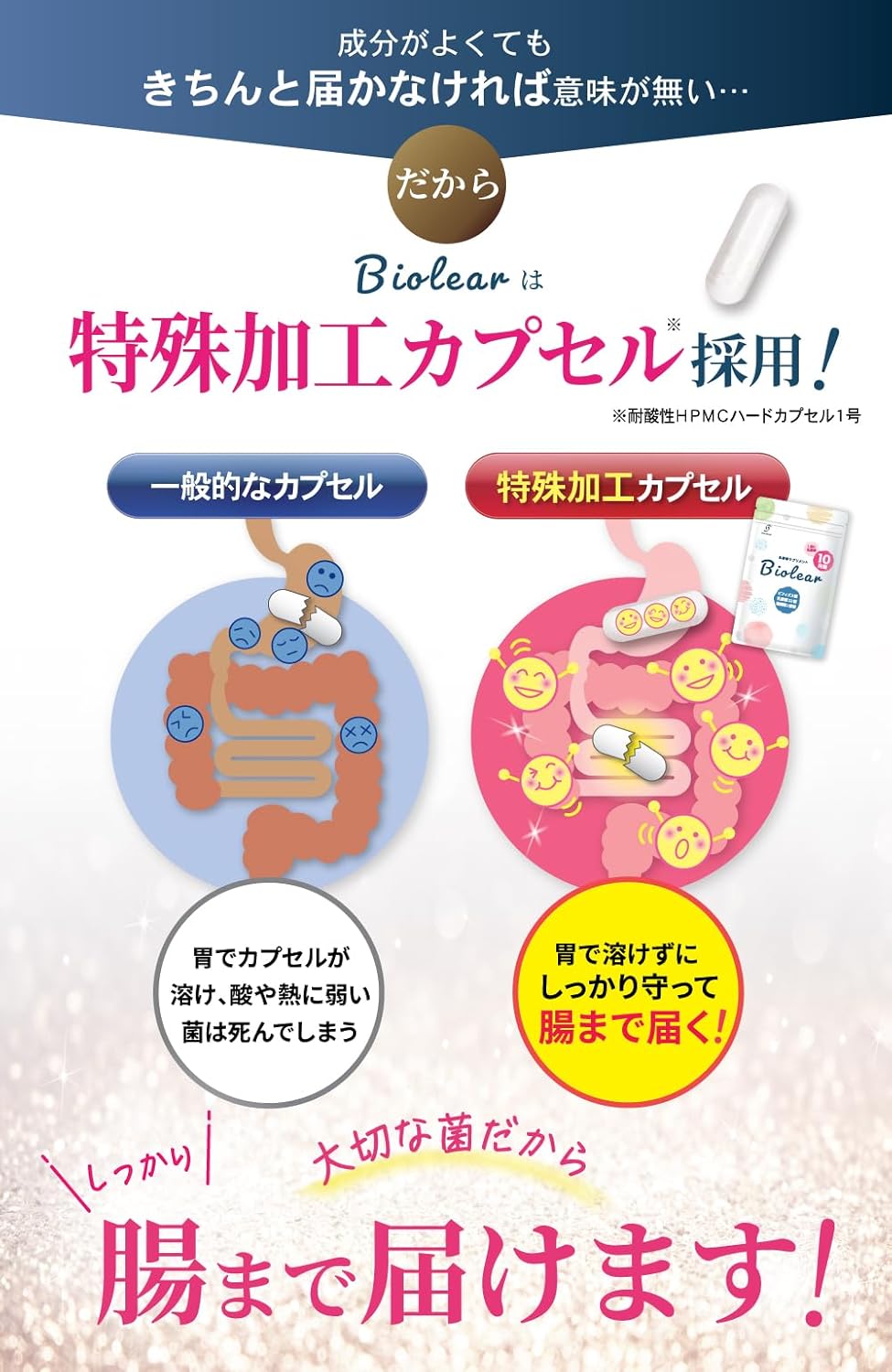 Biolearは打錠でもソフトカプセルでもなく耐酸性カプセルを採用しています。大切な菌たちをしっかりと腸まで届けます。