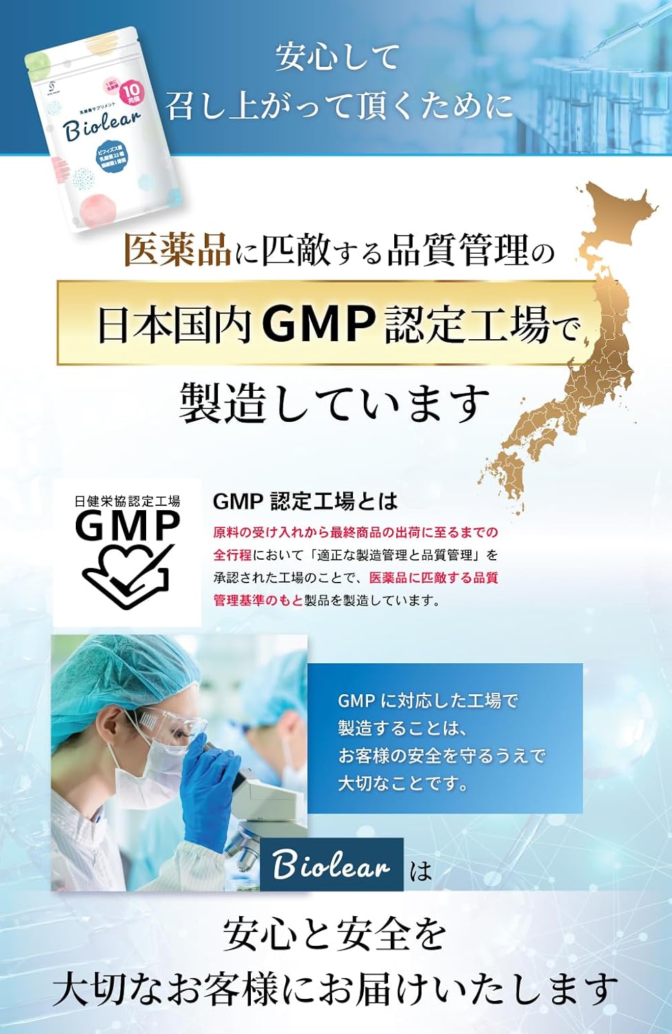 大切なお客様に安全な商品を届けるために、国内GMP認定工場で製造しております。 また、企画、製造、品質管理、販売まですべて日本国内で行っております。