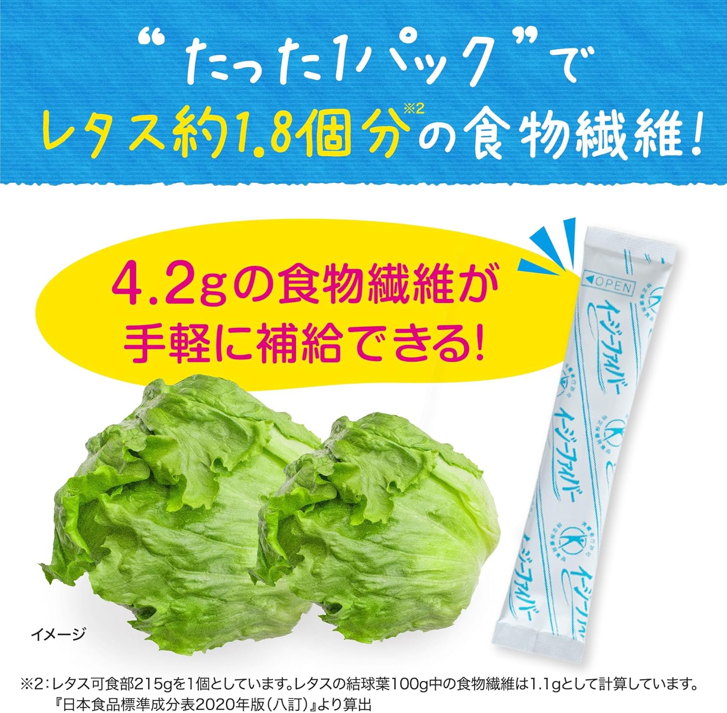 ✅【1パックで食物繊維が4.2g】成人女性の食物繊維摂取目安量※2は1日当たり18g以上です。しかし、20代女性の1日当たりの平均摂取量※1は14.6gで、目安量に足りていません。イージーファイバーなら不足分を手軽に補えます。 ※1:20代女性平均摂取量…国民健康・栄養調査(令和5年)による ※2:目標量…日本人の食事摂取基準(18~64歳女性、2025年版)による