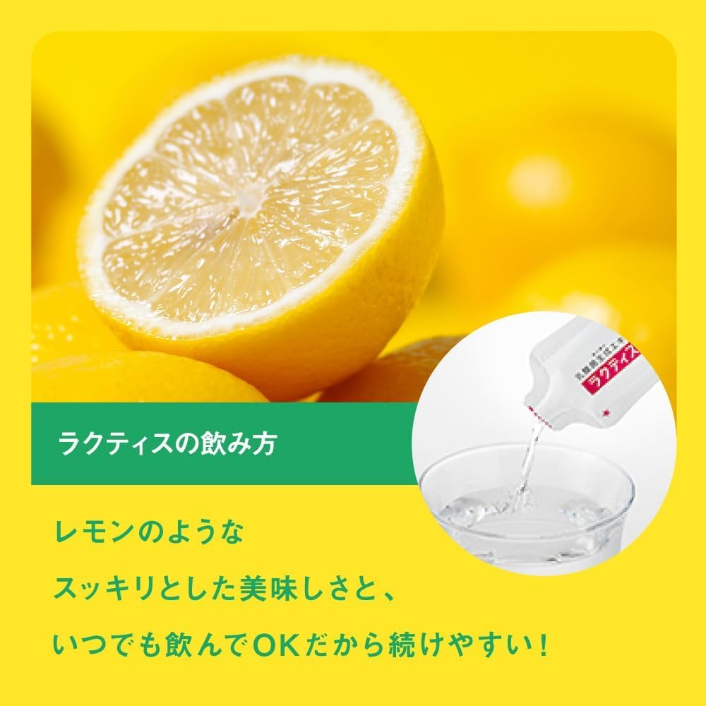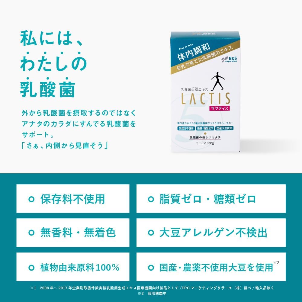 「ラクティス(LACTIS)」は、大正3年創業、日本初のヨーグルト製造販売を開始した(株)ビーアンドエス・コーポレーションが製造・販売する乳酸菌生成エキスサプリメントです。 ラクティス(LACTIS)は一般的な乳酸菌サプリと違い、生きた乳酸菌ではありません。乳酸菌が発酵と熟成によってつくりだした成分(乳酸菌生成エキス)が、わたしが元々もっている「自分本来の乳酸菌」にはたらきかけ、内側からの身体環境をととのえます。 毎日続けるものだから、カラダにいいものを。ラクティスは、・脂質、糖類ゼロ。・砂糖、保存料不使用。・無香料、無着色。・植物由来原料100%。・農薬不使用の国産大豆使用。・乳アレルギーの方もOK(カゼインフリー) 大豆アレルゲンも不検出。 【飲み方】1日1~2包目安にお好きな時間・飲み物(温かい飲み物もOK)に入れてお飲みください/【原料】乳酸菌生成エキス(大豆を含む)、クエン酸、乳酸/【内容量】5ml×30包(30日分)/乳酸菌飲料 【保存方法】直射日光を避け、冷暗所に保存してください/【製造】日本国内健康補助食品GMP認定の自社工場