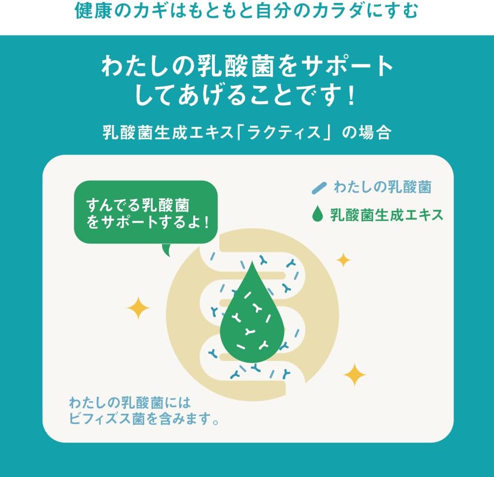 ラクティス(LACTIS)は一般的な乳酸菌サプリと違い、生きた乳酸菌ではありません。乳酸菌が発酵と熟成によってつくりだした成分(乳酸菌生成エキス)が、わたしが元々もっている「自分本来の乳酸菌」にはたらきかけ、内側からの身体環境をととのえます。