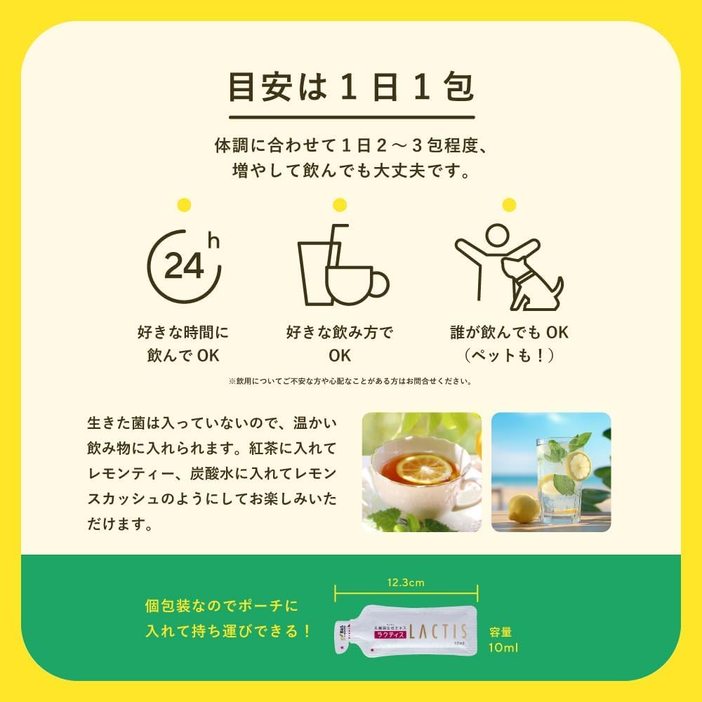 1日1~2包目安にお好きな時間・飲み物(温かい飲み物もOK)に入れてお飲みください/【原料】乳酸菌生成エキス(大豆を含む)、クエン酸、乳酸/【内容量】5ml×30包(30日分)/乳酸菌飲料