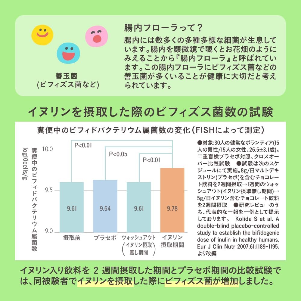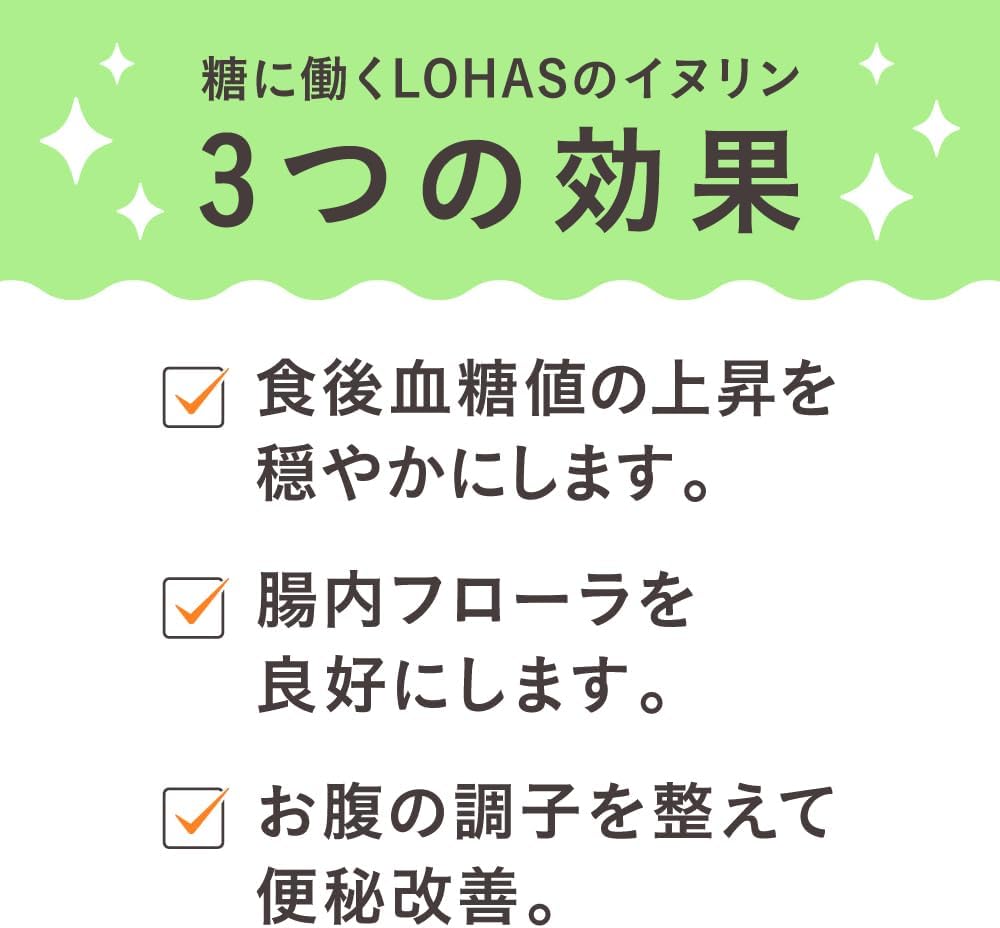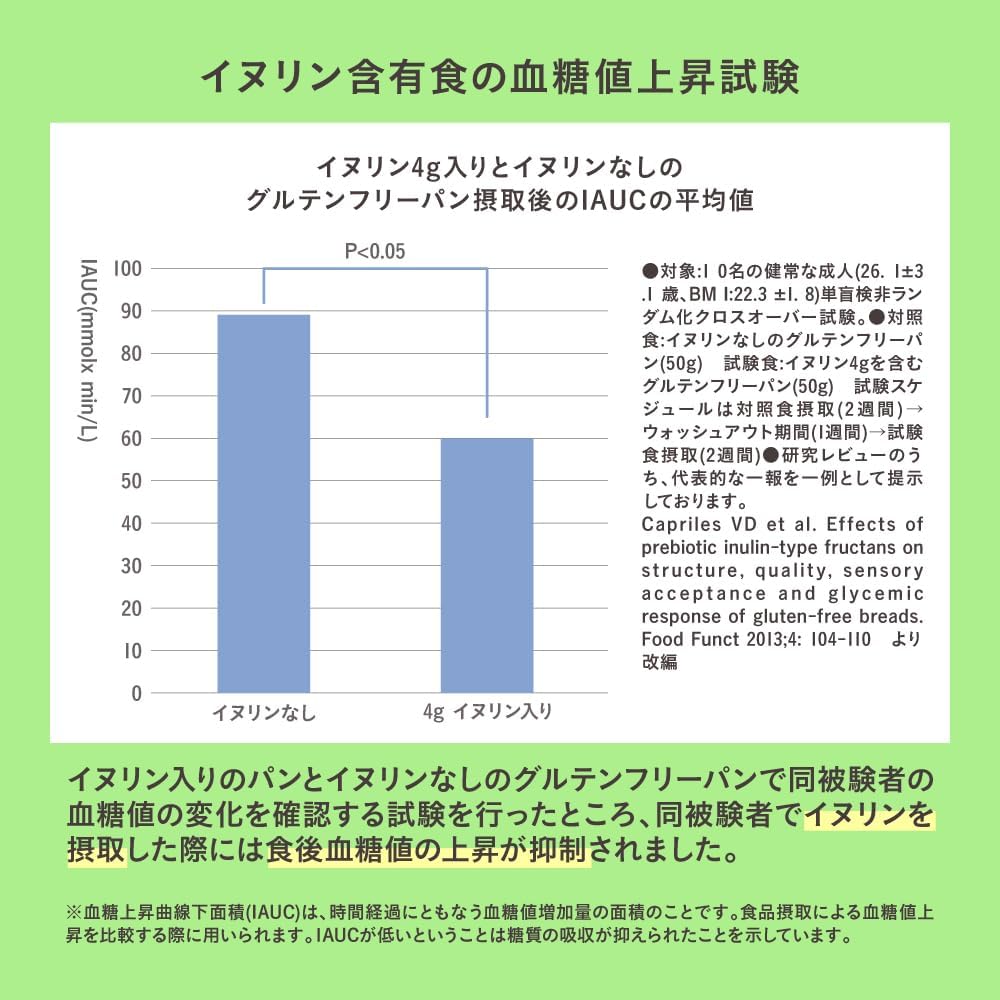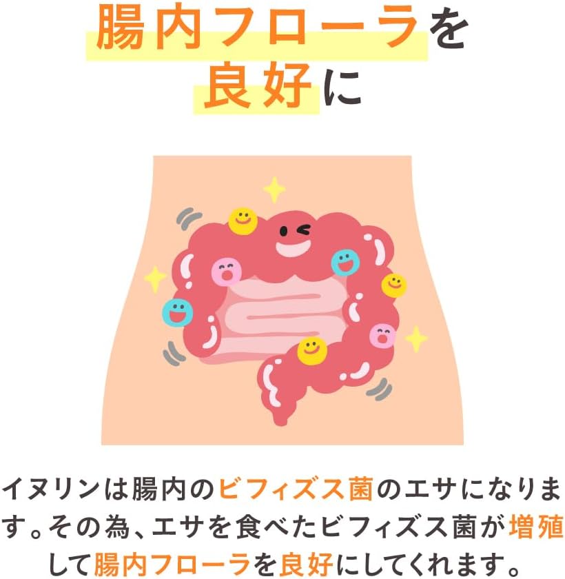 本品にはイヌリンが含まれます。イヌリンは、腸内のビフィズス菌による発酵・増殖に利用され、腸内フローラが良好になることで、便秘傾向者において排便回数・排便量を増やし、お腹の調子を整えることが報告されています。 また、イヌリンは食後の血糖値の上昇を緩やかにすることが報告されています。 本品はお腹の調子を整えたい方、食後の血糖値が気になる方に適した食品です。