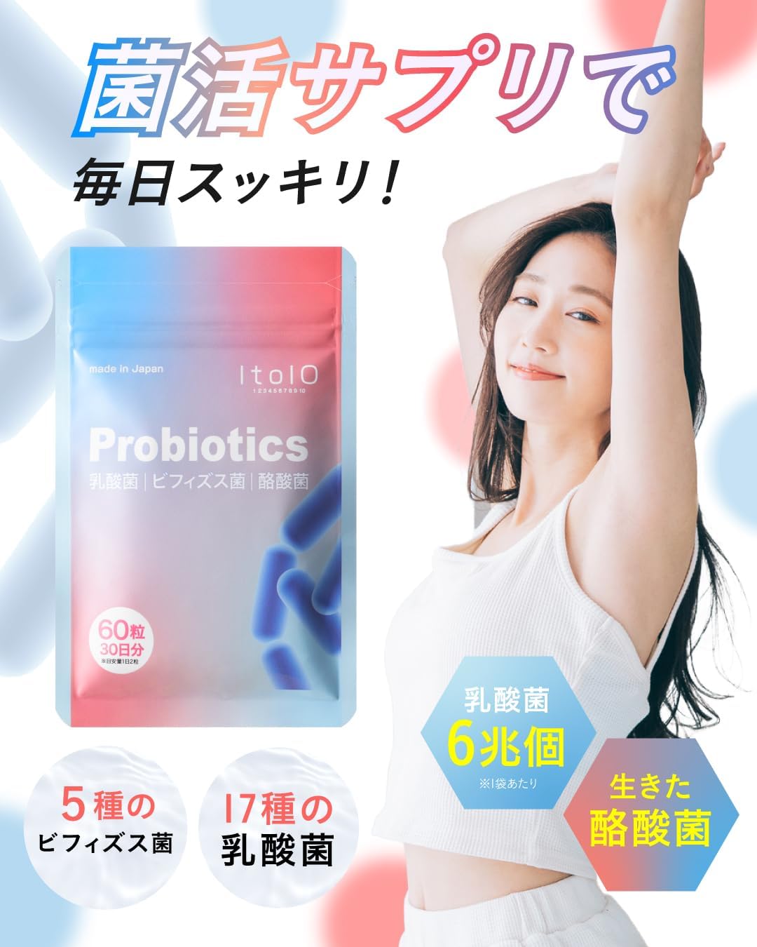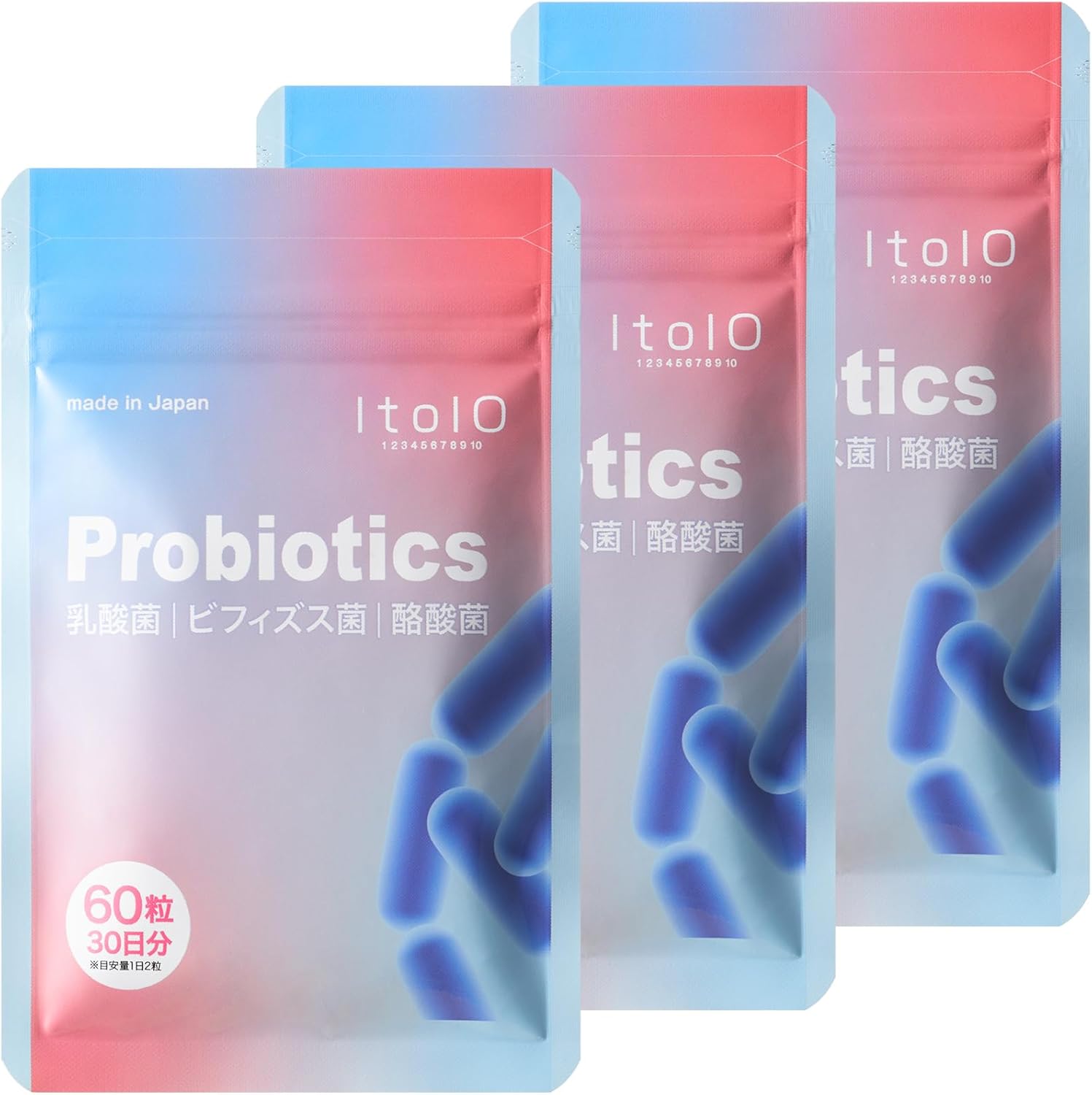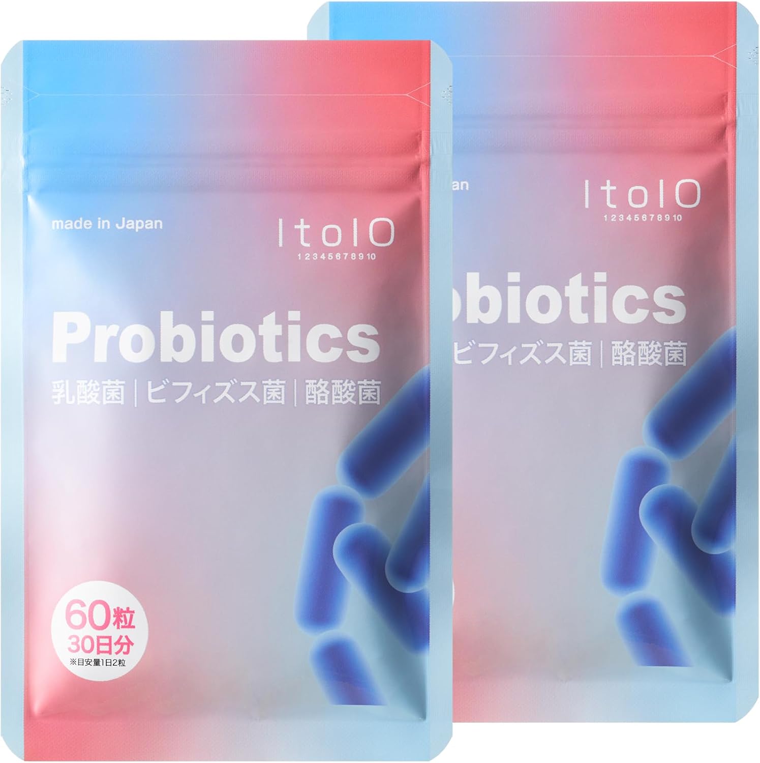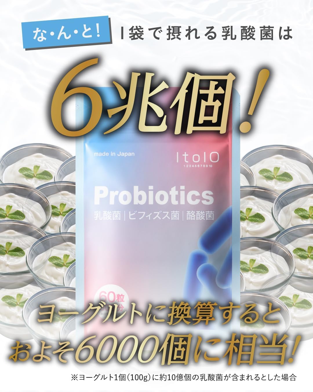 ✅【1袋で6兆個の乳酸菌(ヨーグルト約4,000個分※)を配合】ltoloの乳酸菌サプリメントは善玉菌を届ける「乳酸菌・ビフィズス菌・酪酸菌」と善玉菌を助ける「オリゴ糖・難消化性デキストリン・イヌリン・ナットウキナーゼ」を贅沢に配合。1日2粒で体内フローラを整えて、毎日すっきり。※ヨーグルト1個(100g)に約10億個の乳酸菌が含まれるとした場合