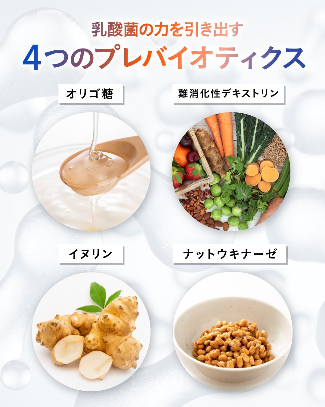 ✅【善玉菌をサポートする4つの成分】善玉菌のエサとなり、善玉菌を増やす働きをもつオリゴ糖・難消化性デキストリン・イヌリン・ナットウキナーゼを配合。乳酸菌の力をさらに引き出します。