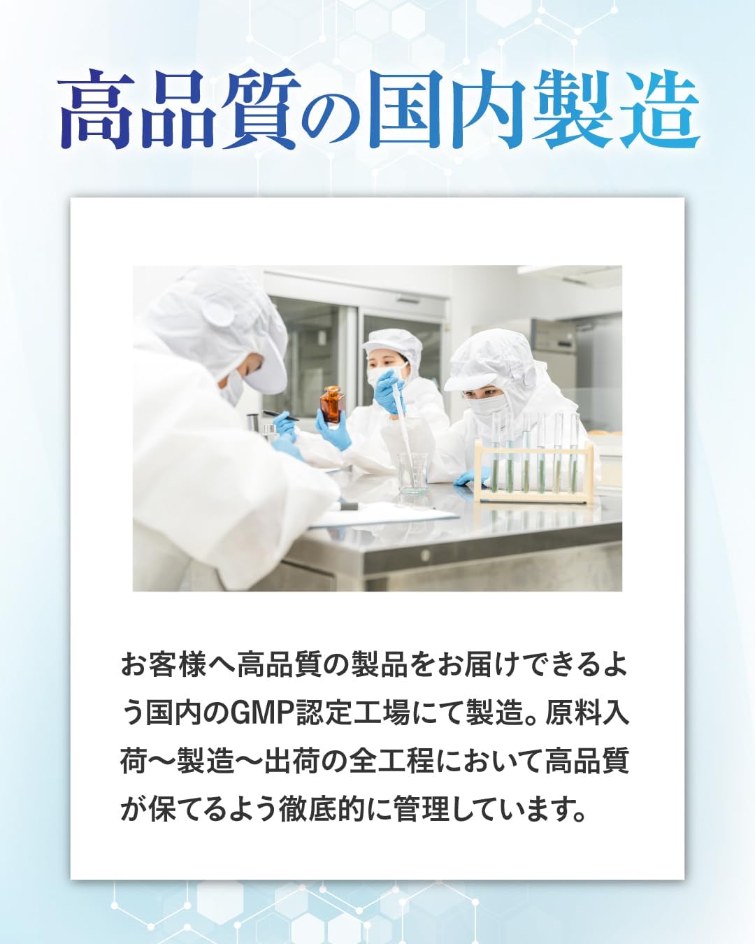 ✅【国内のGMP認定工場製造】お客様へ高品質の製品をお届けできるよう国内のGMP認定工場にて製造。原料入荷〜製造〜出荷の全工程において高品質が保てるよう徹底的に管理しています。