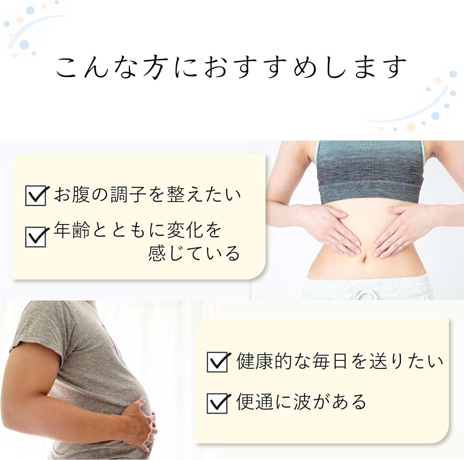 体調や体質により、まれにお腹の調子が変わることがあります。その場合は量を減らすか、一時中止してください。