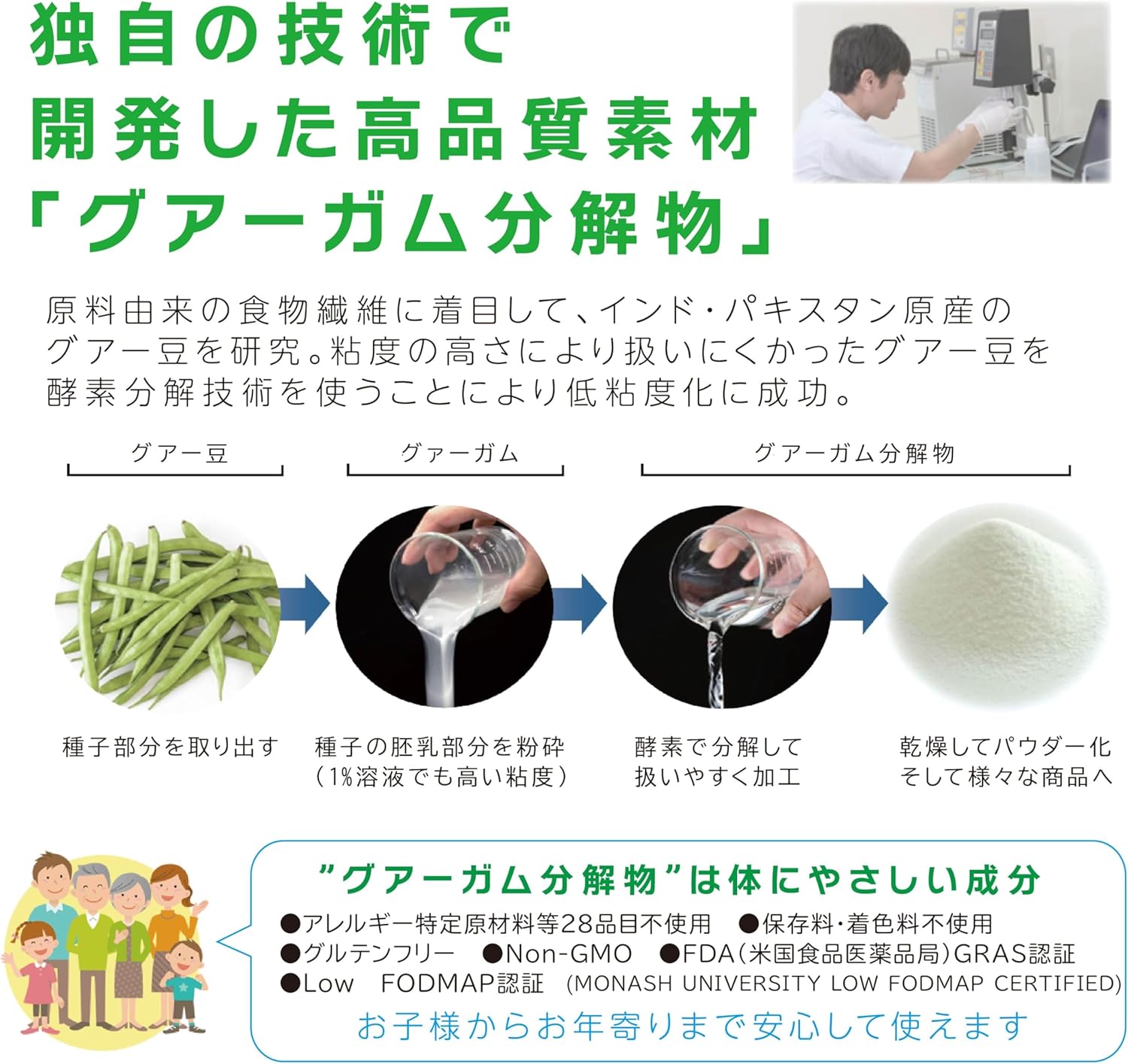 グアーガム分解物(PHGG)とはインド・パキスタン地方で、古くから健康によい豆野菜として食されているマメ科の植物グァー豆の種子部分の主成分、グァーガムを食べやすく酵素の力で低粘度化したものです。