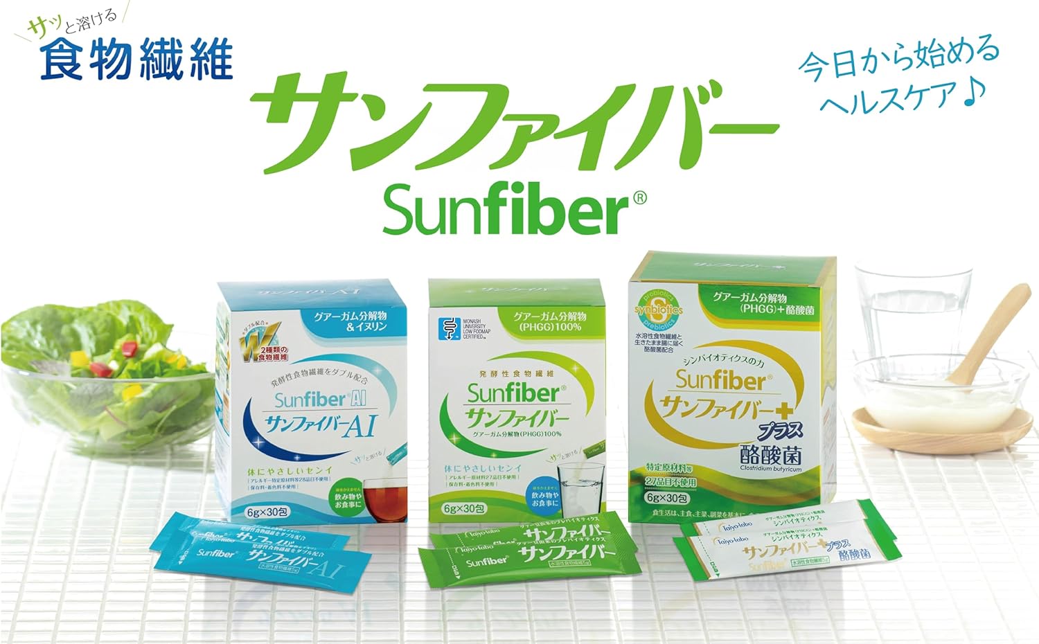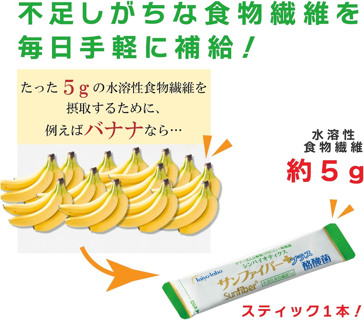 サンファイバーはグァー豆から生まれた体にやさしい水溶性食物繊維のです。外出時の携帯にも便利なスティックタイプは1包で不足しがちな水溶性食物繊維を約5g補えます。